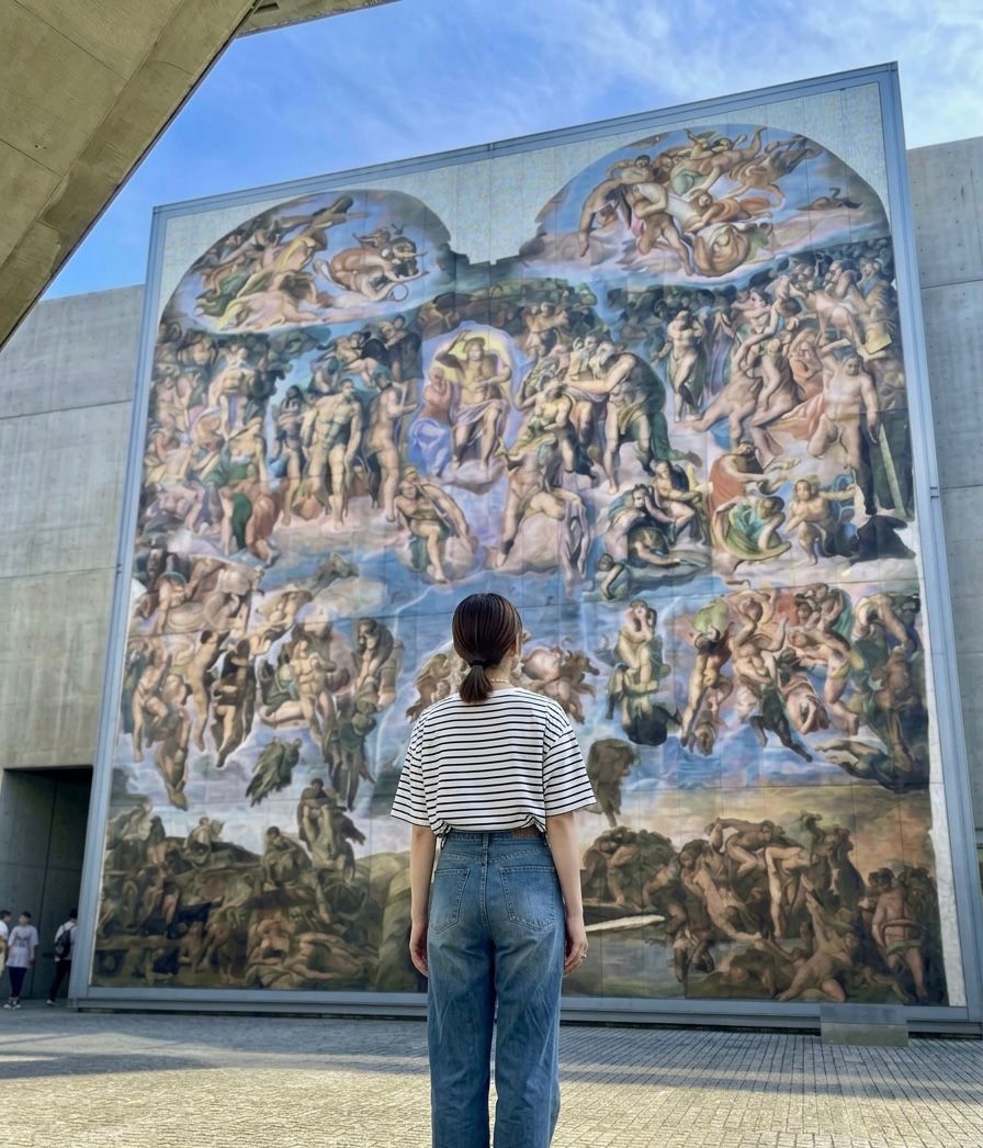 中でも圧倒されたのは《最後の審判》。ミケランジェロの代表作であるこの作品は、ほぼ原寸大で再現されている。最下層から見上げると、上部が見えないほどの大きさで、その迫力に思わず息をのむ。中段、上段へと上がっていくにつれて、次第に全体像が見えてくる。三層構造の空間だからこそ、視点を変えながら何度でも楽しめるのだ。